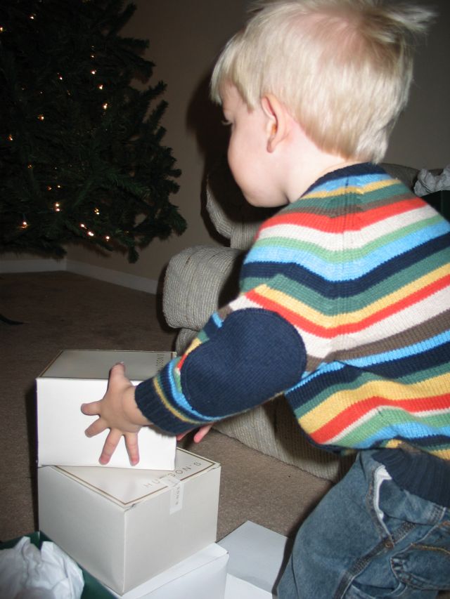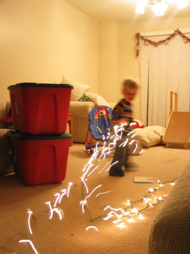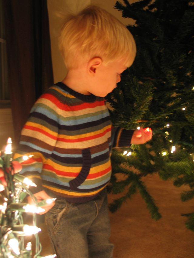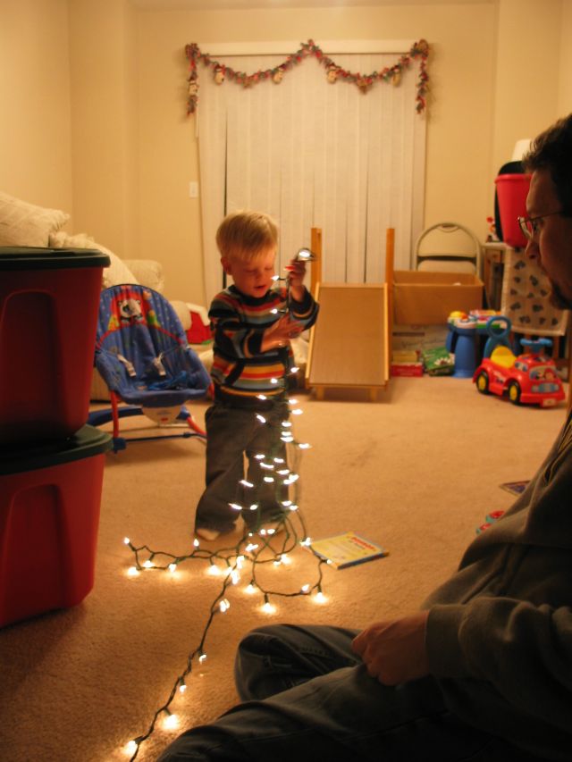 Christmas is almost here, and our house is a winter wonderland of decoration. Elijah is much more aware of what’s going on this year (I don’t think he noticed anything last year being only 6 months old). But at 18 months he loves the decorations (and seeing what happens when he tries to “redecorate” for mommy sometimes). When we put up our tree Eli seemed kind of oblivious to the big tree going up in his living room (he liked playing with the box the tree was in much more!). And he played with the lights for about one minute before he got bored and decided that reading by Christmas tree lights was better than actually helping put them on the tree.