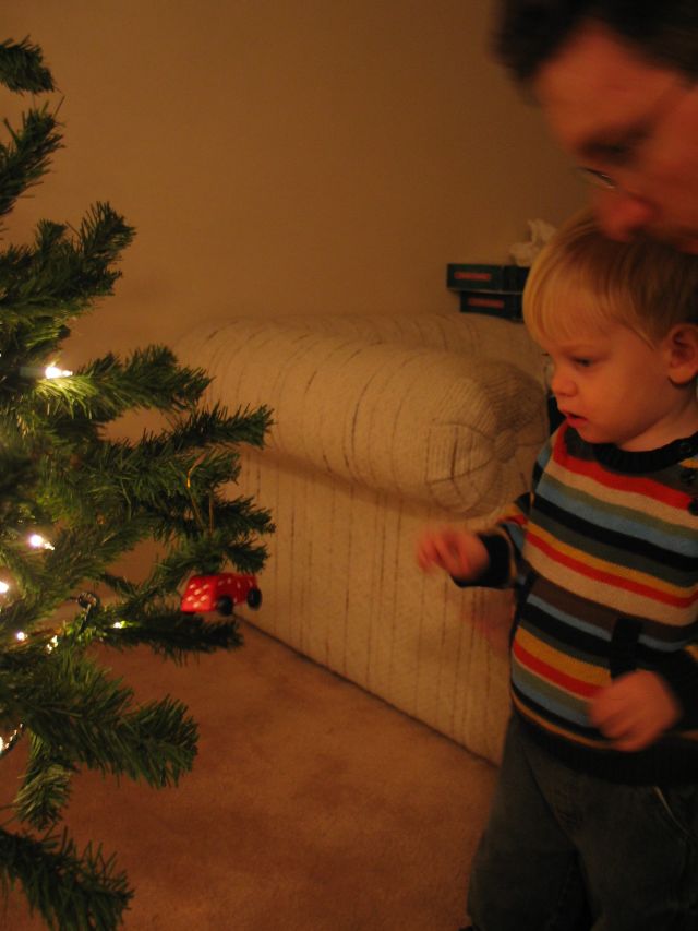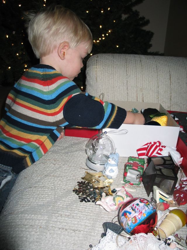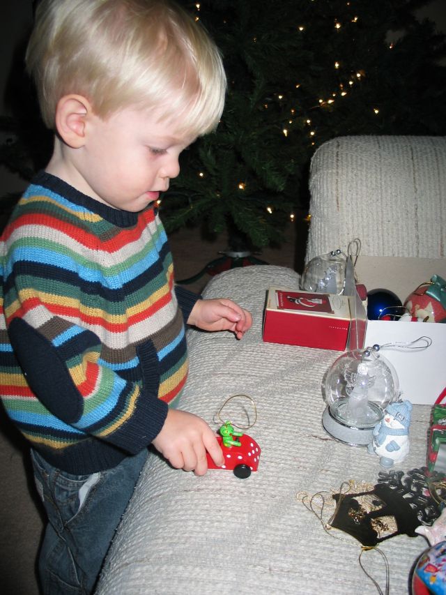 We decided to just create a section at the bottom of the tree of non-breakable ornaments for Eli to take on and off. He now knows he can touch his froggy car, his Veggietales ornament, some stuffed penguins and snowman ornaments I had, and the football Santa Claus. Even with his “permissible” section, after one or two days of taking the ornaments off he pretty much started leaving all of them alone, except for his frog and a stuffed reindeer which he likes.