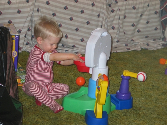 -Opening presents with all the kids was a lot of fun – they all get so excited for their gifts! It’s fun to watch their little faces. Elijah made a haul again, and is having fun with all his toys. I must say, the alphabet train station he received from Grandma and Grandpa is quite the hit. Elijah started combining his sport toy and his train station, and hitting the train station with his bat. Uh oh! Just when I thought we were out of our hitting phase!