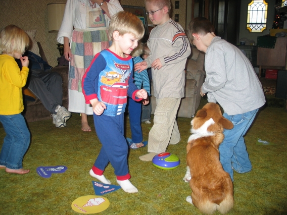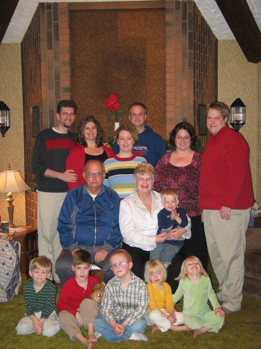 -The twins got a Dora castle from us, and all kinds of figures and furniture as part of their present from Grandma and Grandpa. Finally! Some girl toys which I can have fun playing with too! One bad moment for Dora though – Dante the dog found one of the Dora’s on the floor and chewed her crown and one of her hands off! Ouch, that’s got to hurt, Dora!-After some cajoling, we took a family picture in front of the fireplace. It's pretty hard (even after taking about 15 pictures) to get one with all the adults looking normal, and apparently impossible to get a picture where all the kids are cooperating. So here is the best picture of the bunch - the adults look normal and most of the kids are smiling! To embarass Tori in the future, let it be noted that she was most unhappy to be taking this picture for some reason, and yes, she actually did have this same expression in every single picture we took! Silly girl! I'm going to show this to you when you're 15. :)