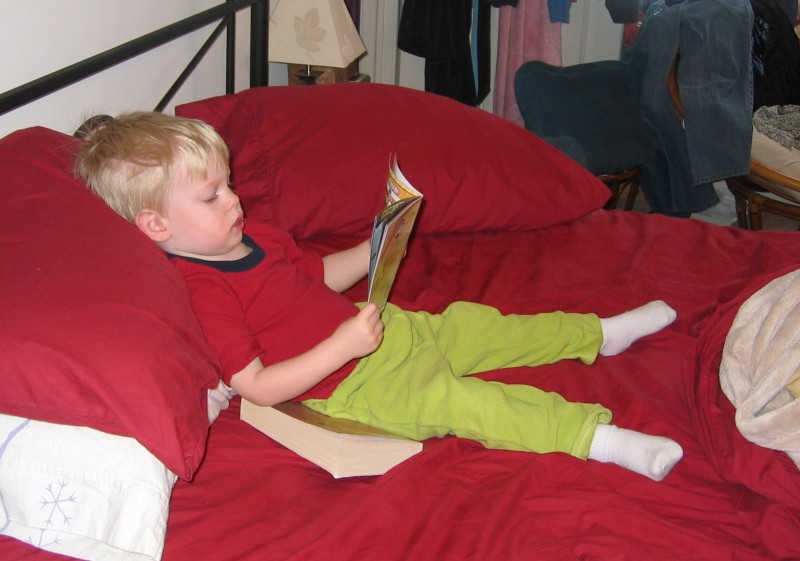 - Jon and I were packing feverishly Thursday night to get Elijah and ourselves ready for our trips, and Eli got a little bored watching and helping us. So he just climbed on the bed with a book and sacked out for a bit. So cute. :)