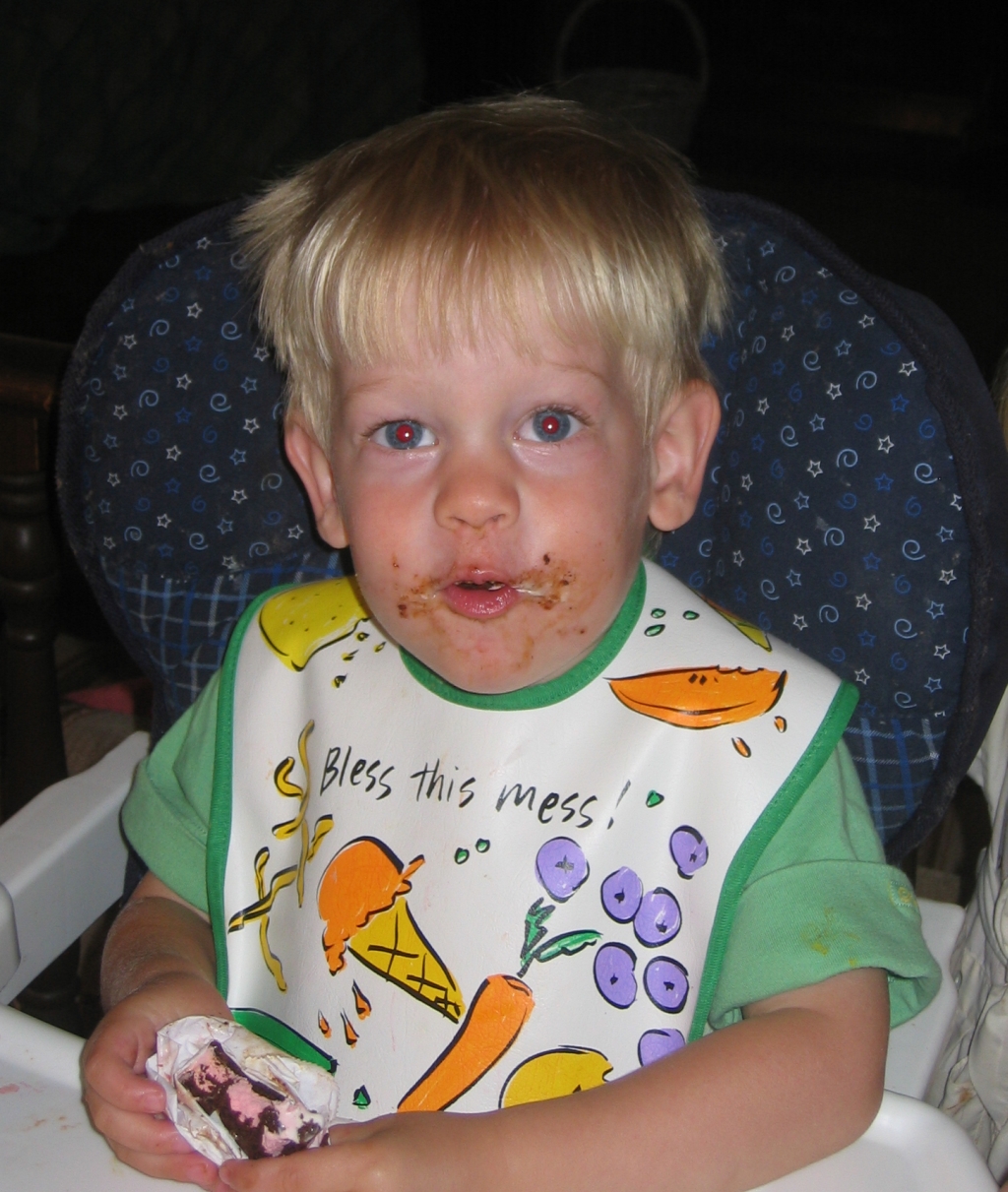 Elijah was being watched by Grandma on Sunday afternoon (along with his cousins Lexi, Tori, and Noah) and after dinner they had dessert - an ice cream sandwich. This was Eli's first ice cream sandwich ever, and when he started eating it Grandma told us that he said, "Mmm, cold cake!" Isn't that so precious?! Jon and I arrived in time to see him eat the last quarter and he was still telling us that is was a cold cake and going mmm-mmm. Guess he liked it!