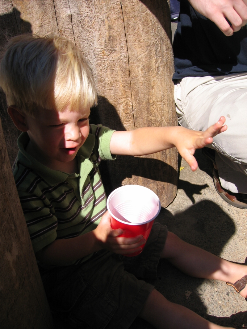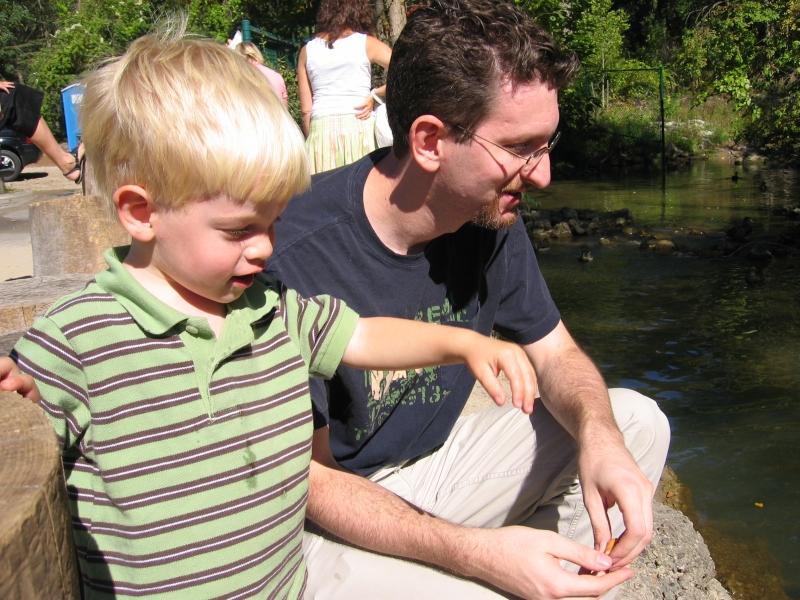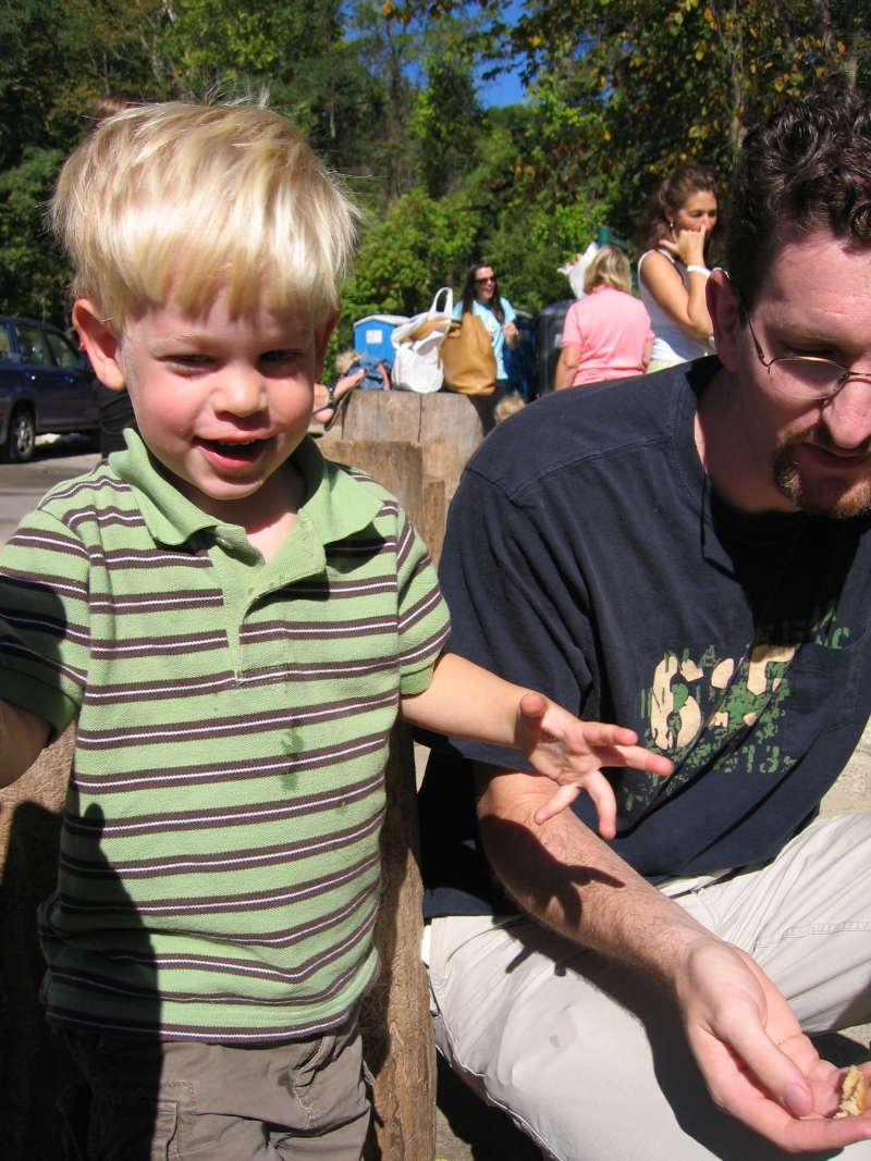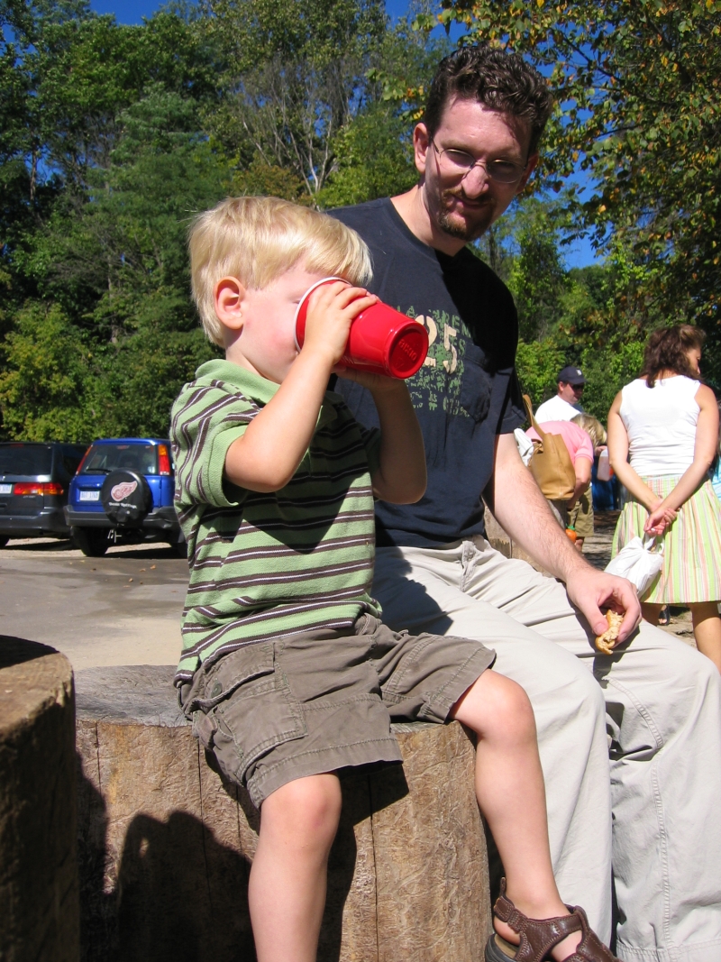 Elijah is old enough to have the cider now, and he did enjoy it quite a bit. I think we enjoyed hearing him say the word "cider" even more though. It's quite cute. The donuts and the ducks were the biggest hit with him though. The cider mill sits on a stream, which hosts an impressive population of ducks. These lucky duckies (I couldn't wait to type that) are living large and eating the most expensive duck food around - cider mill donuts. I would imagine these ducks have the highest cholesterol of any other ducks known to man, since their diet is a steady stream of deep-fried donuts tossed from the sticky paws of the toddlers that line the banks of the stream. Some parents had the sense to bring cheaper duck food - crackers or bread - but Eli's parents weren't part of that smart pack. Instead we watched Eli throw bits and pieces of the ridiculously priced donuts to the ducks. Eli got a kick out of it, and, really, he was doing us a favor since otherwise those extra donuts would have found their way into our mouths. Better to fatten the ducks than fatten me I suppose! Jon's already exploring the cider options near Grand Rapids, and though some of the cider may not be quite as good, at least it's a whole lot cheaper! :)