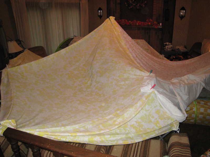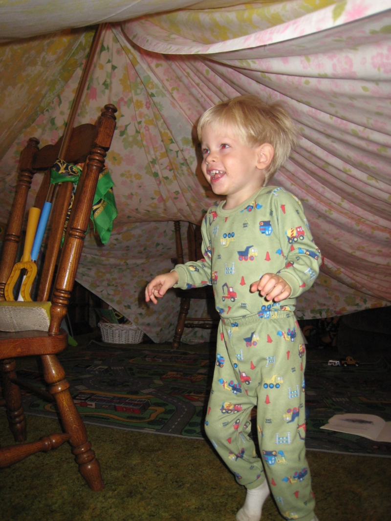 Last Thursday it was raining and cold outside, and Elijah was not interested in any of his gazillion toys. So Mom had to get a little creative. I always loved building sheet forts in the living room when I was little, so I brushed off my old skills and built one for Elijah! It was fun to figure out how I used to do it (I was a little rusty), but in the end Elijah thought it was pretty cool to run around inside and have to crawl out the tunnel to exit. Lexi and Tori came over Thursday afternoon and we played games in the fort. We had a lot of fun, and I already have some ideas to improve the fort on the next rainy day.