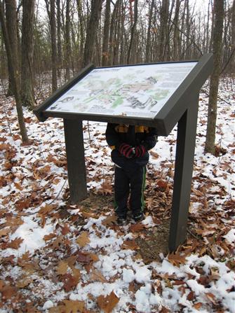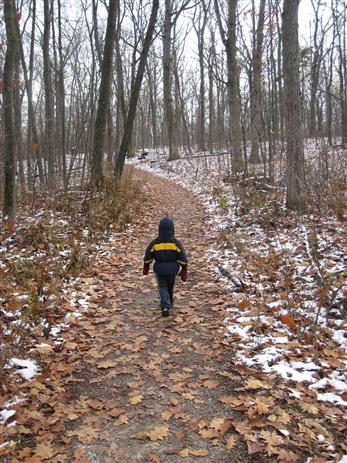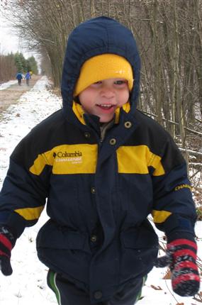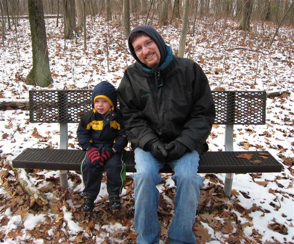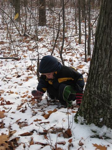 Eli really got in to walking in the woods, and Jon and I couldn’t walk fast enough for him, he was so eager to explore the trail. At one point he got it in his head that the leaves needed to have the snow brushed off of them. In a woods there are lots of leaves on the ground, so it took quite a while to convince him that they didn’t ALL need to be cleaned off.