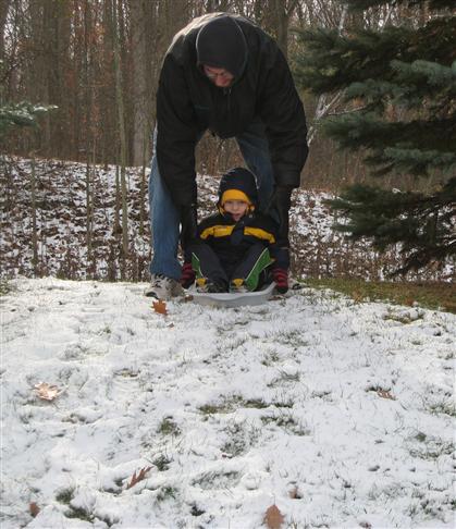Elijah really liked walking on the snow, or “crunching snow” as he called it. He wasn’t so sure about the sledding at first, but thought it was really fun to watch Daddy sled down the hill (Mommy thought that was fun too).