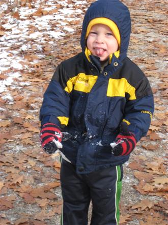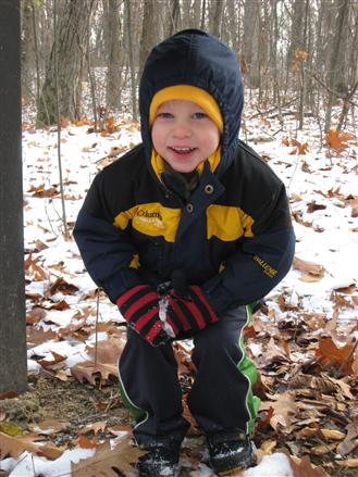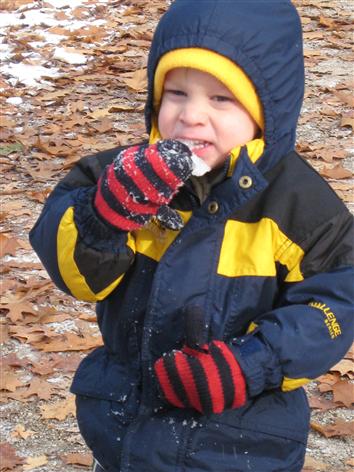 Eli also found a piece of snow covered ice off in the woods and decided to have a taste. It wasn’t quite what he was expecting! I remember eating snow when I was a kid and loving it (the good clean, just fallen snow), so we’ll see if Elijah likes to eat snow too. He didn’t think the ice was that great though.