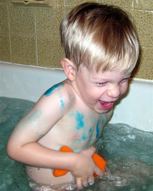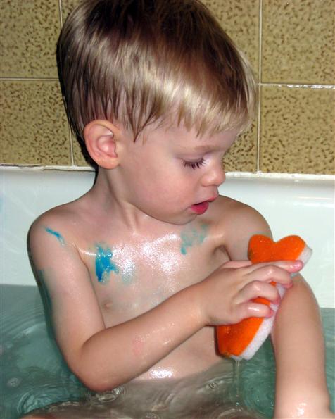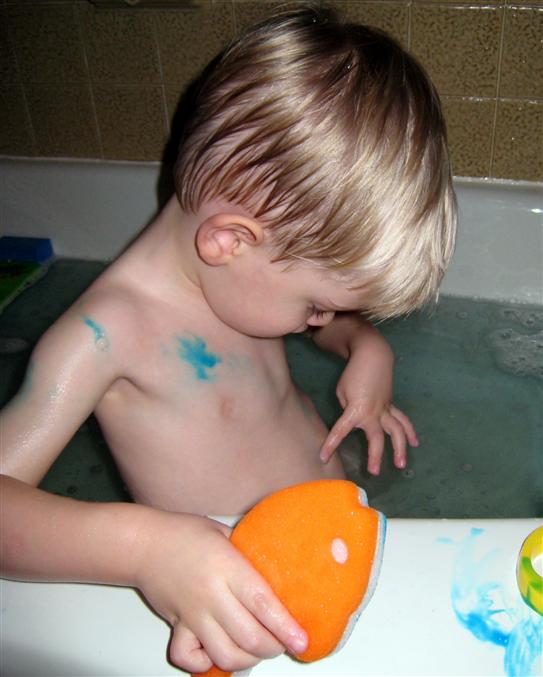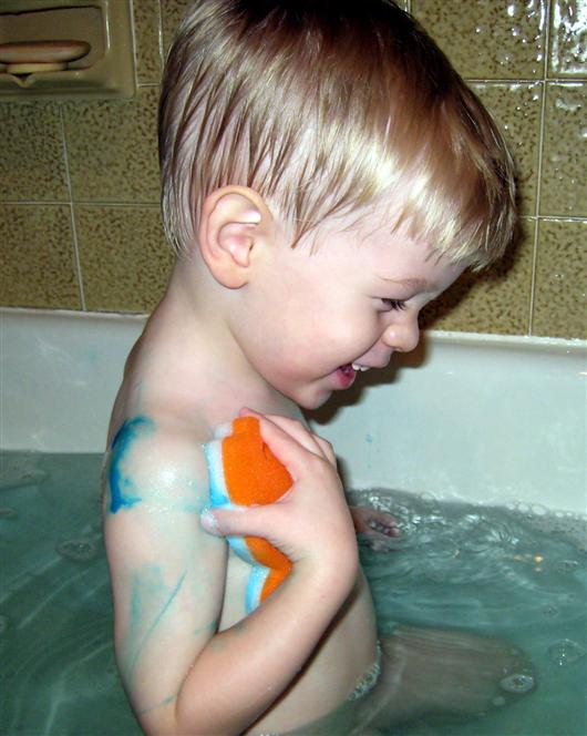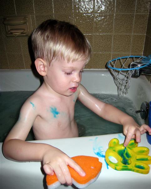 For Christmas Eli had gotten these bathtub finger paints which I had read a lot about and had put on his list. Turns out that they don’t seem to work to draw paintings on the tub very well, but they do work great to make splotches all over Elijah! That’s actually what he’s most interested in doing anyway, so it all works out. We’ve been having fun in the tub turning Eli into a spotted-Eli, and that’s pretty much all Eli wants to do in the bathtub now. Mommy splotches him up (which we turn in to a game in itself) and then Elijah takes the fish sponge that came with the paints and tries to clean himself off before Mommy can put more spots on him. We may not be using the paints like I thought we were going to, but I think we’re having a lot more fun playing with them our own way!
