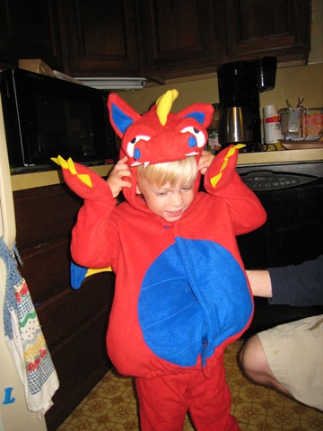 Well, after that I had to try and find a toucan outfit for Halloween for Eli . . . but after exhaustively searching the Internet could only come up with a pattern to make one. Which was not going to happen. Then I was in Old Navy doing a little shopping and came across a dragon costume. Well, Elijah loves to pretend to be a dragon (I was actually quite certain he was going to pick to be a dragon in the story) and it was perfect for him. So I scrapped the toucan idea and picked up the dragon costume.