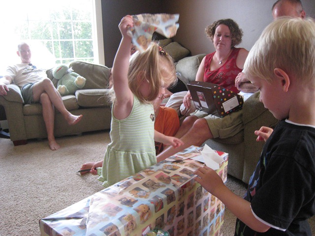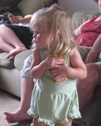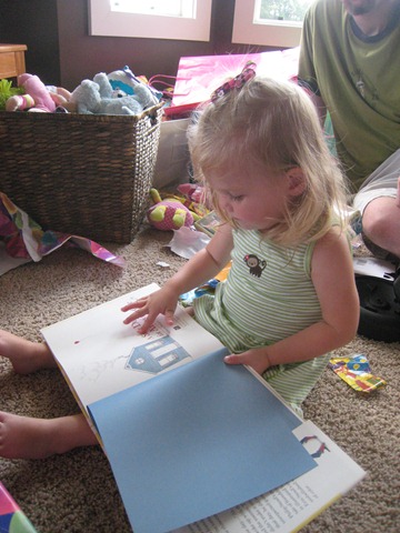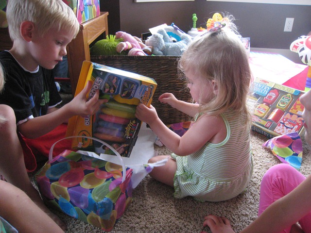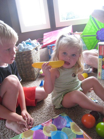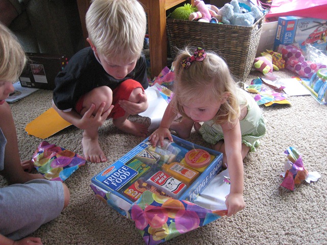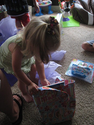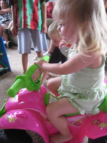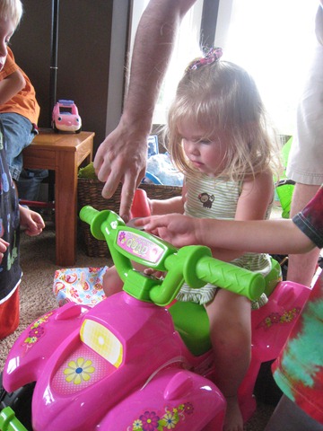 The last gift of the party was a pink battery-powered quad from Mommy and Daddy. Matea had played on one at Catherine’s house the week before and seemed to like it, and, quite frankly, we were out of ideas of what to get her. Since it was on sale at Target we went for it. I think so far Eli has enjoyed it more, but Matea does like it. She’s still getting the hang of holding the button in to keep going. Right now she just presses the button, moves about one foot, smiles and squeals, and then says, “no, no, no,” when it stops. She’ll get the hang of it soon though I think!