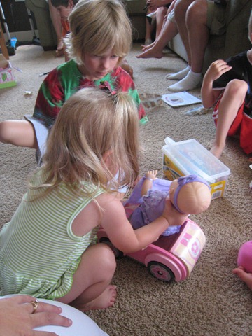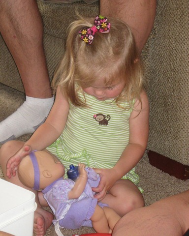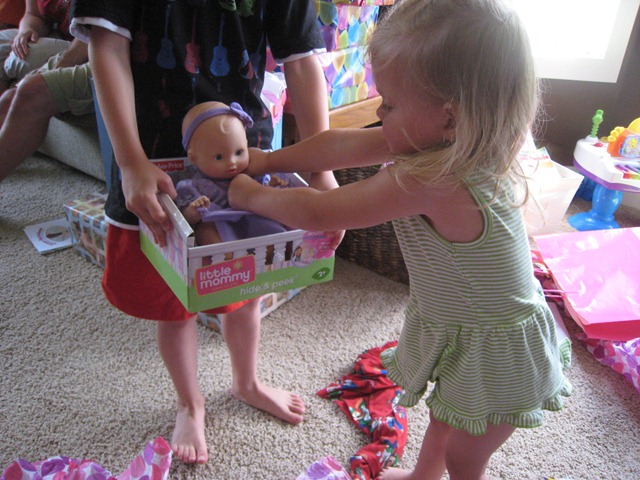 Matea got a personalized bag, which she now carries everywhere, and a baby that play peek-a-boo. You have to touch the forehead to make it work, and Uncle Jeff discovered that head butting the baby works great too. Good thing my kids are past the baby stage, right? Or else no more kid-watching for Uncle Jeff. :)