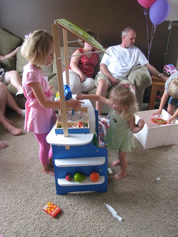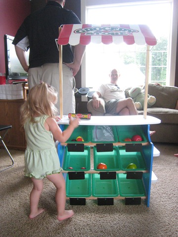 And from Grandpa Bob and Grandma Sherry came a grocery store/lemonade stand (the sign reverses)! The grocery store was the hit of the party, and Matea LOVES LOVES LOVES it!